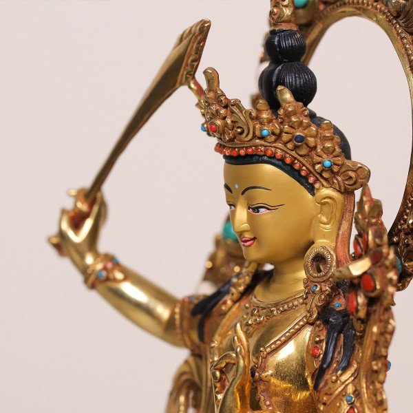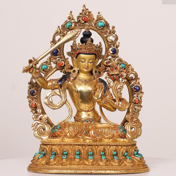 此尊文殊菩萨像,铜鎏金镶宝石彩绘,华丽庄严、精工细致,菩萨面容慈悲智慧,令人一见心生欢喜,心悦臣服。 得金菩提宗师殊胜的开光加持,祂的目光所及之处,遍照吉祥之光;慧剑所指之处,一切邪魔鬼怪全部回避。 愿有缘迎请供奉者,破除无名、降伏妄念、智慧通达、成就大愿。