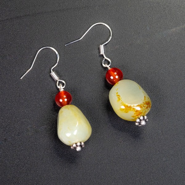 此款和田玉耳环,由随形的和田玉小籽料(流水料)串连而成,富有返璞归真的禅意美感,它带着金色和红色的沁皮,更给人以十分富贵、吉祥的美好祝福。