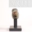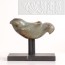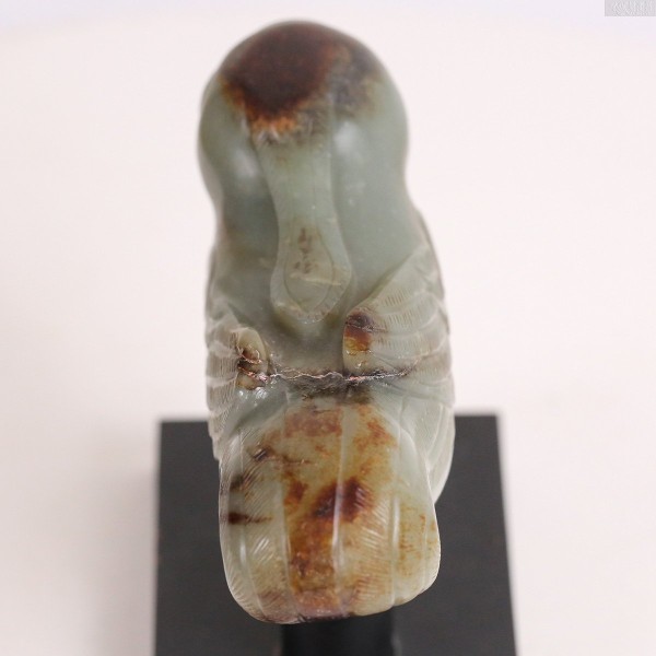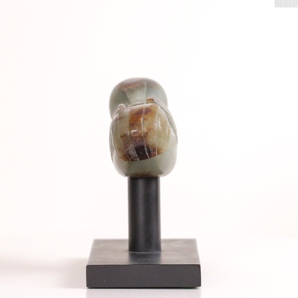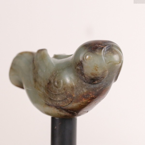 此件以青玉雕成,玉质细腻温润,呈灰青色调,局部带有深浅不一的褐色沁痕,散发古雅朴实之韵。杖首圆雕为鸠形,尖喙微弯,双目圆睁,头顶长翎向后上扬,两翼贴伏于身侧,身躯饱满厚实。羽翼与尾部以细密阴线刻饰,长尾微微卷曲,展现生动自然的姿态。底部设有圆形榫孔,用以衔接杖身。整体造形灵巧可爱,气韵温润而含蓄,充满古朴的生命力。