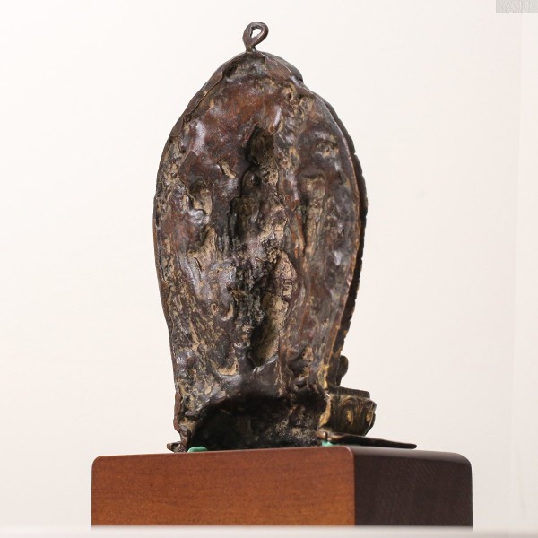 菩萨像主体为黄铜铸造,头冠、眼睛、耳环、项圈,臂饰、飘带,其精美细致,令人惊叹称奇。