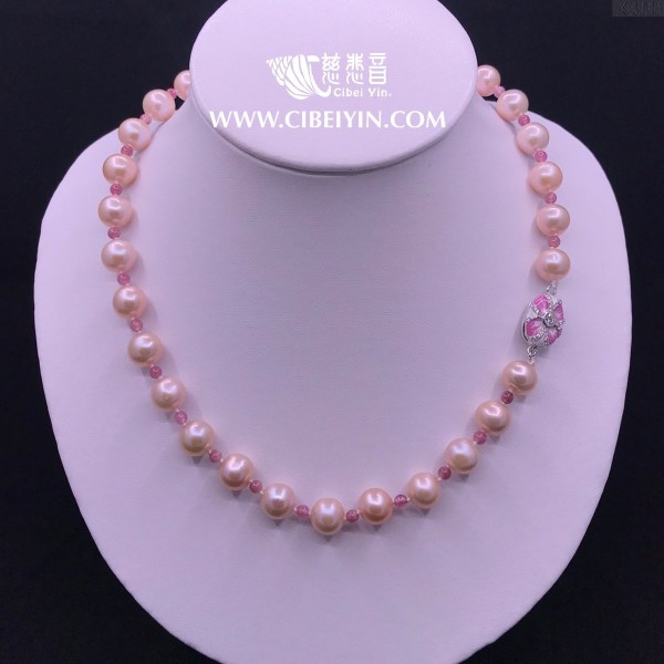 材质:9mm 淡水粉珍珠 3mm 粉色碧玺 925银扣