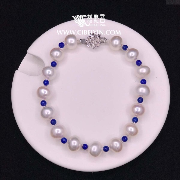 Material:8.5-9mm freshwater white pearl 3mm lapis lazuli 925 silver buckle